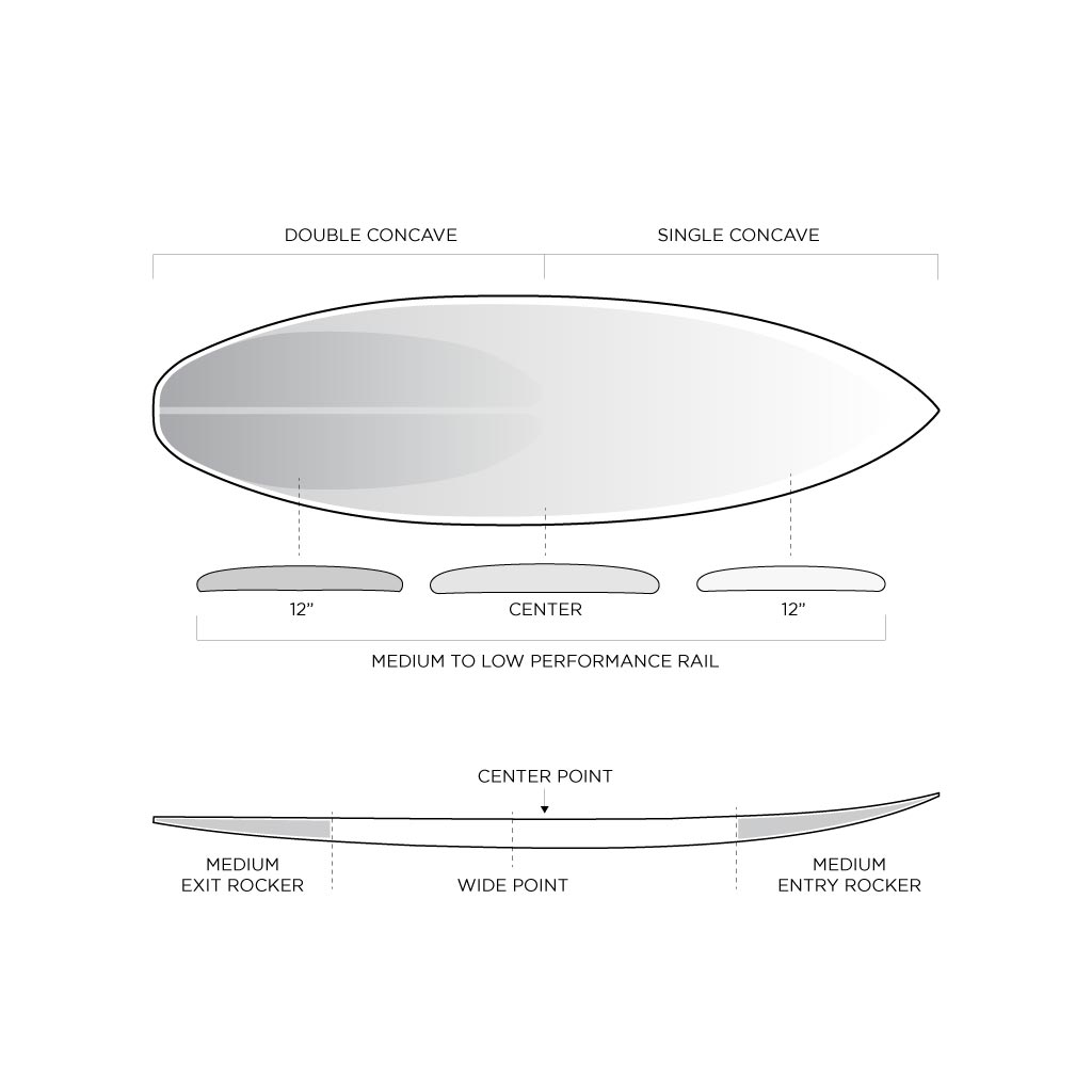 The obvious outline change is the tail going to a squash from the round tail. Also, the rails are slightly more refined and performance oriented. The concave is the same under the front foot but splits into a subtle, double-barrel and V out the tail in the last 5”. I normally look for a round tail to provide smoothness in transition from rail to rail and during turns, but the squash tail is proving to not only have that quality as well, but also a bit more release in the turns.